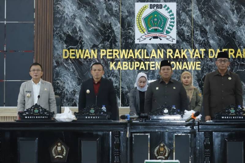 Sidang dipimpin Ketua DPRD Konawe, I Made Asmaya, S.Pd., MM, dan dihadiri langsung Bupati Konawe, H. Yusran Akbar, ST, Wakil Bupati H. Syamsul Ibrahim, SE, M.Si, Forkopimda, Sekretaris Daerah Dr. Ferdinand, SP., MH., serta para kepala Organisasi Perangkat Daerah (OPD) lingkup Pemda Konawe.