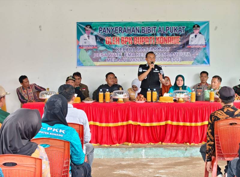 BAITSULTRA.COM/KONAWE – Bupati Konawe, H. Yusran Akbar ST., menyerahkan bantuan bibit tanaman Alpukat kepada masyarakat Desa Watarema, yang berlangsung di Balai Desa Watarema Kecamatan Lambuya. Kamis (12/2/2026).
